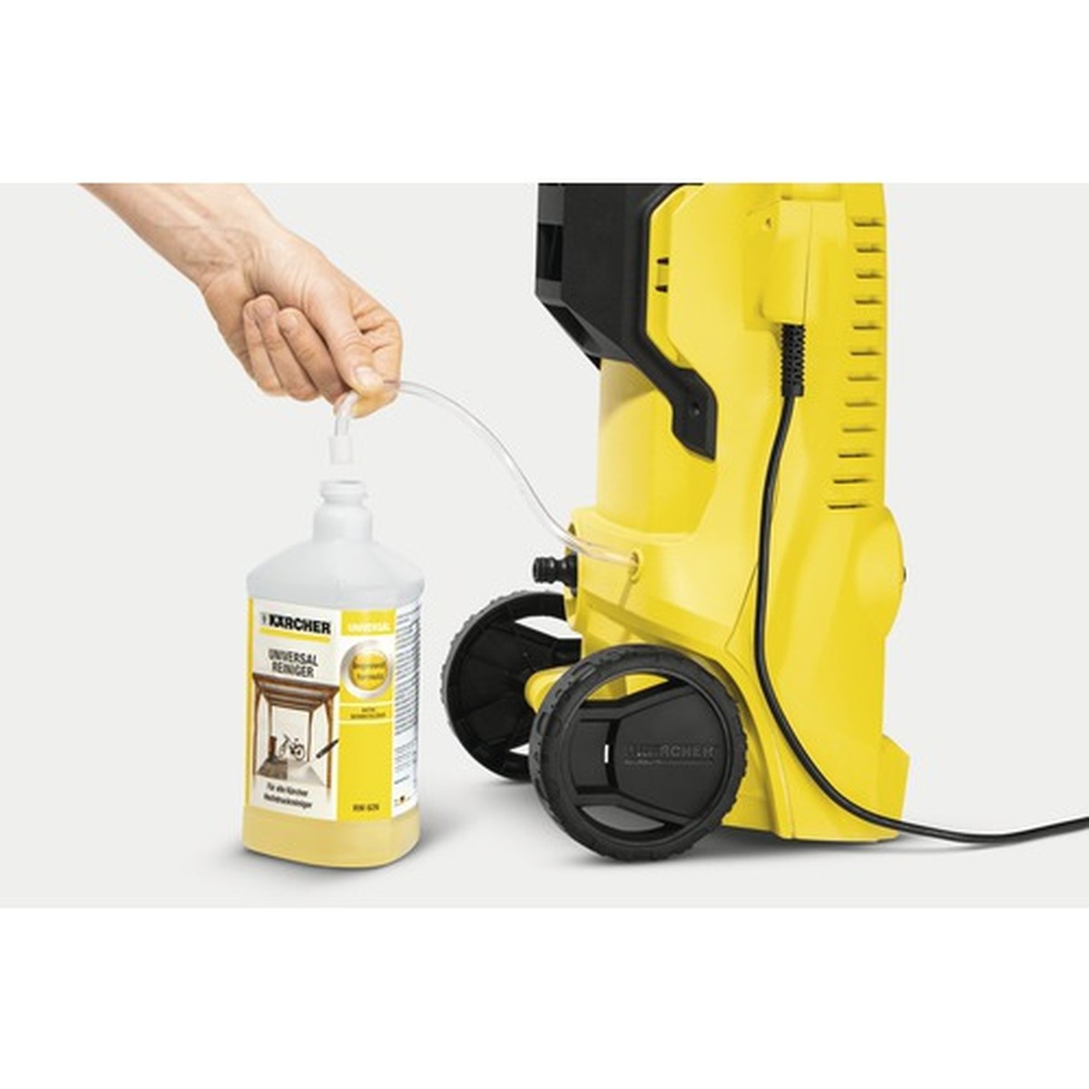 Kärcher K2 Power Control oferă trei niveluri de presiune reglabile și un mod dedicat pentru detergent. Setările pot fi ajustate ușor prin răsucirea lăncei de pulverizare Click Vario Power, permițând adaptarea forței de curățare în funcție de suprafața tratată. Furtunul de absorbție integrat facilitează aplicarea rapidă și confortabilă a soluțiilor de curățare.