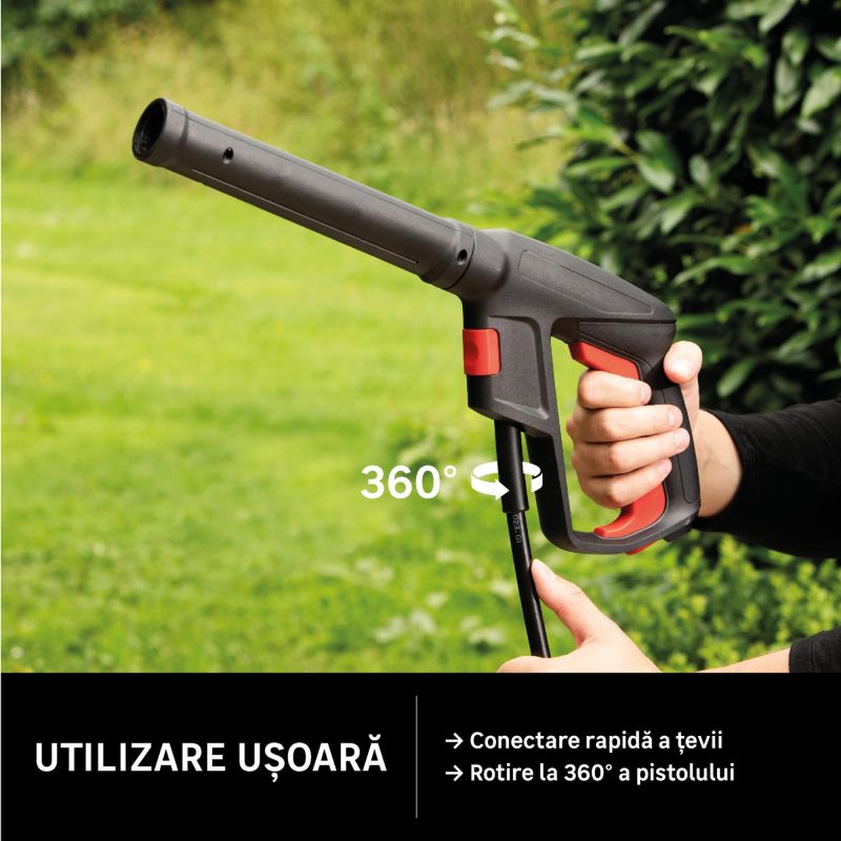 Echipamentul se remarcă prin versatilitate datorită duzei 5 în 1, care oferă cinci tipuri de jet: jet creion pentru decapare, jet mic plat pentru clătire, jet mare plat pentru curățare eficientă, jet rotativ pentru murdărie dificilă și jet de spumă pentru aplicarea detergentului. Sistemul Quickconnect 360 facilitează utilizarea, permițând conectarea rapidă a furtunului și rotirea acestuia la 360° fără încurcare.