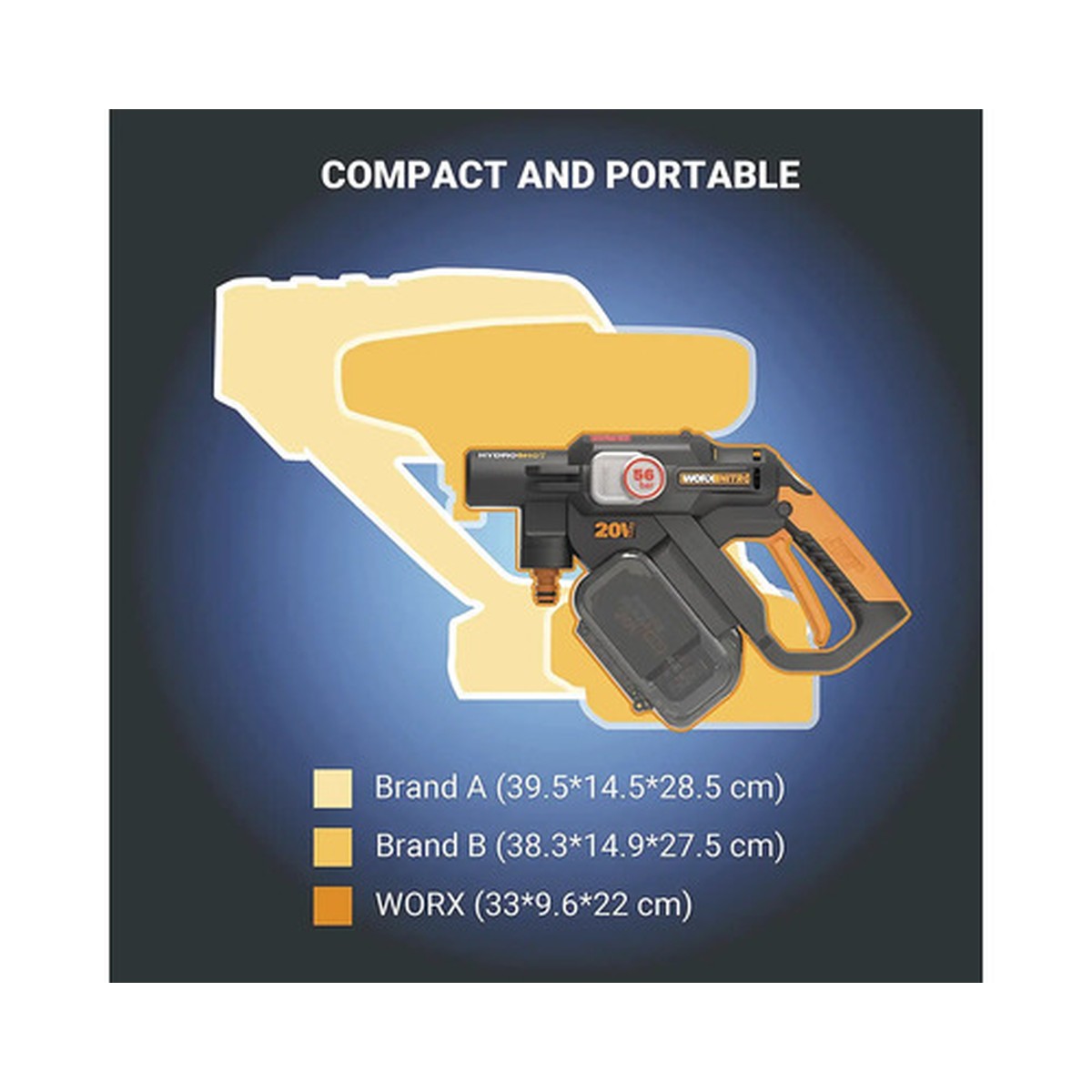 Dezlănțuie puterea aparatului de spălat cu presiune pe bază de acumulator Worx WG633E.9 20V. Cu o presiune maximă de 56 bar și un debit de 220 l/h, acest dispozitiv portabil este soluția ideală pentru curățarea podelelor, a zonelor exterioare și a obiectelor de grădină.