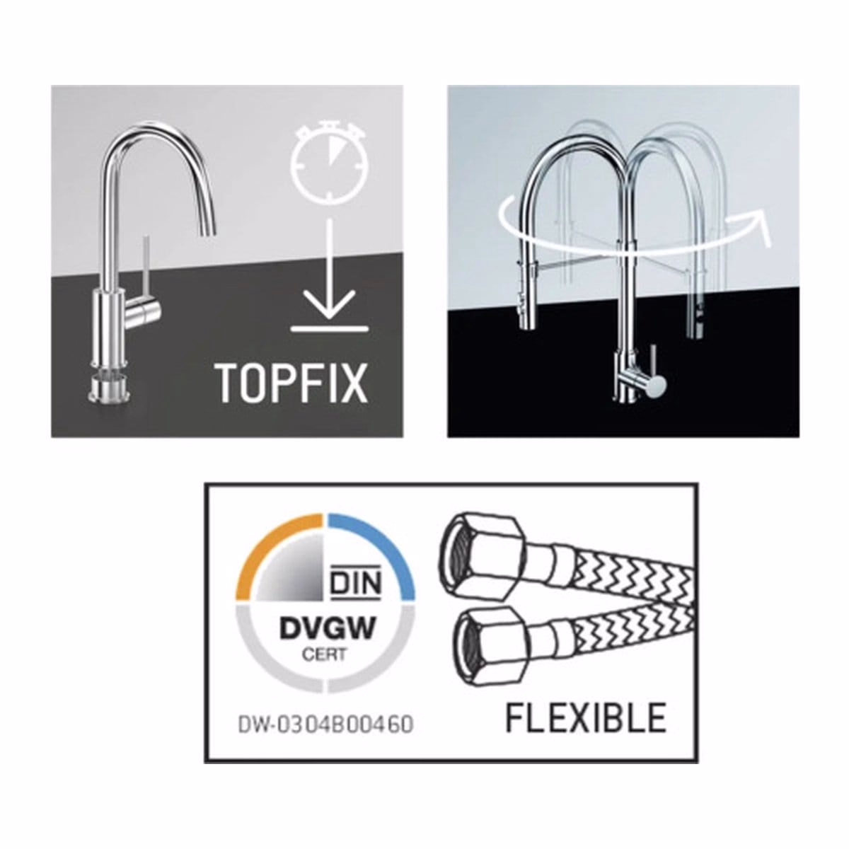 ✅ Caracteristici: Pipă pivotantă, Montaj rapid de sus „Topfix”, Baterie monocomandă, Cartuș ceramic