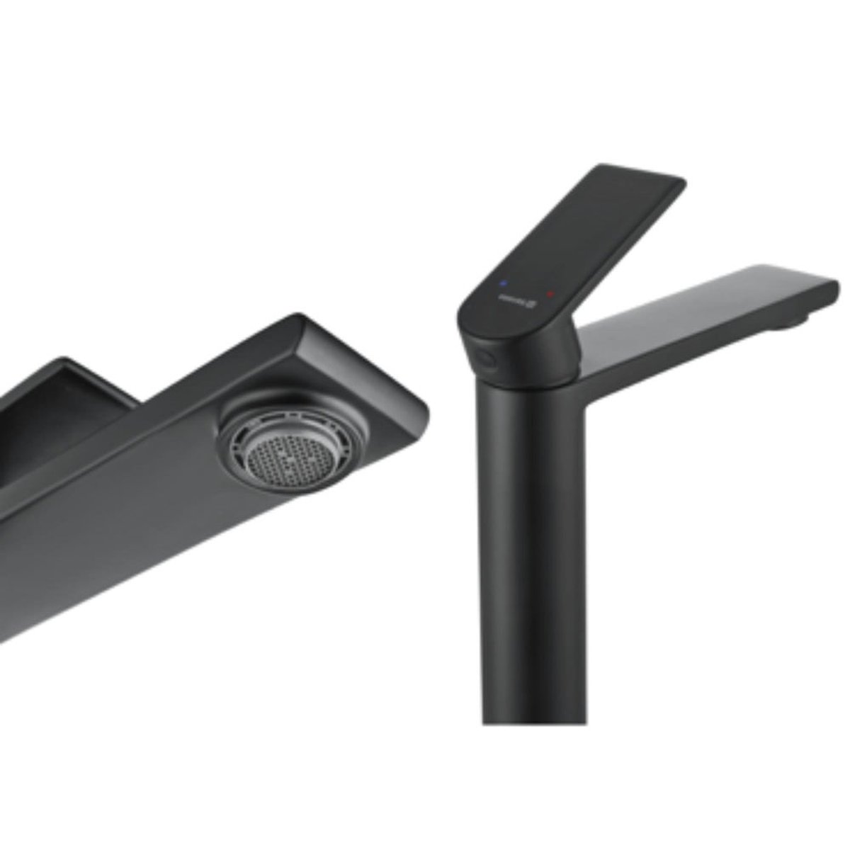 Eleganța minimalistă întâlnește funcționalitatea în bateria înaltă pentru lavoar Sensea Cinta. Finisajul sofisticat în negru mat conferă un aer de rafinament modern oricărei băi, transformând-o într-un spațiu de inspirație.