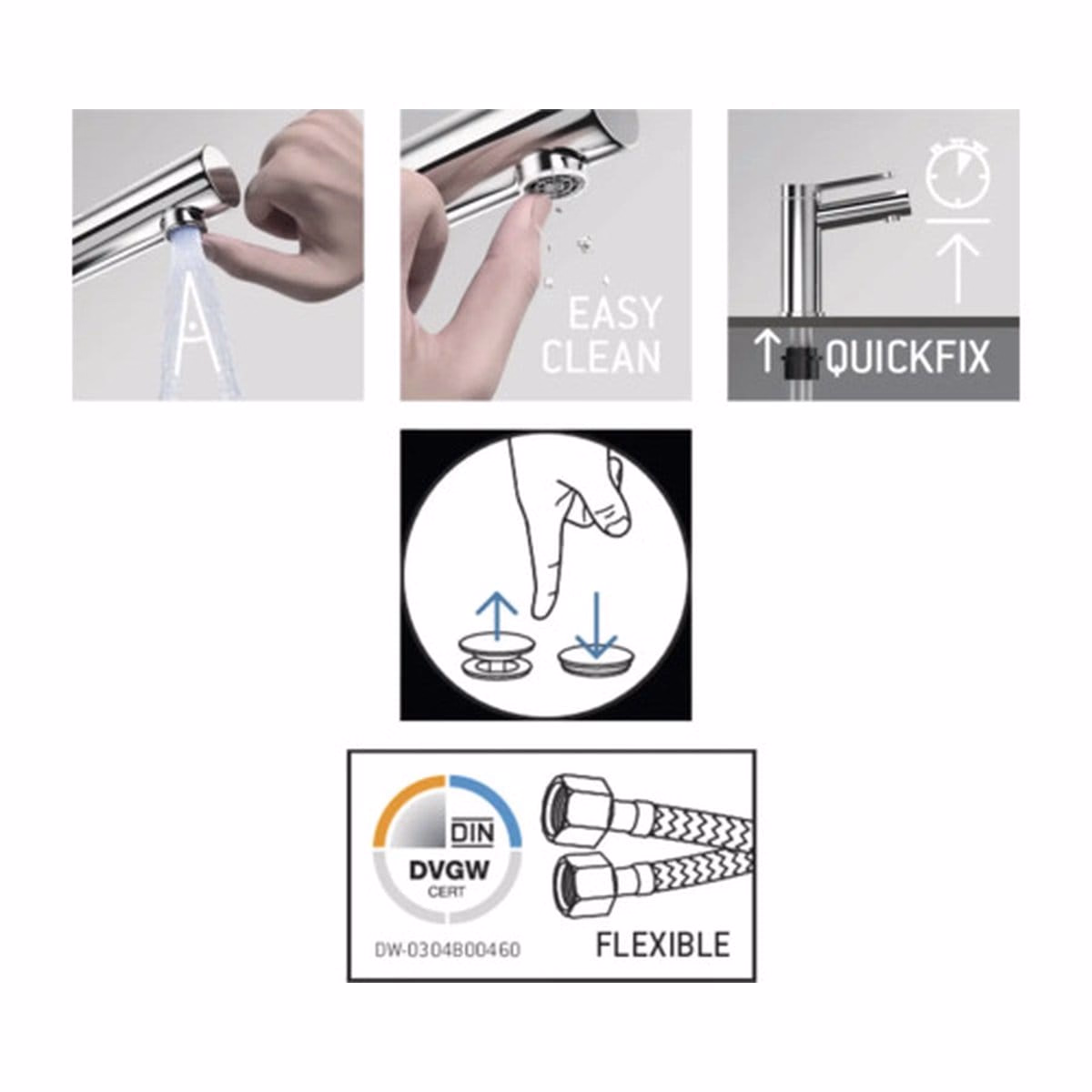 Această baterie este perfectă pentru lavoare și lavoare pentru mâini din baie sau toaleta oaspeților. Designul său compact o face ideală pentru spațiile mai mici.