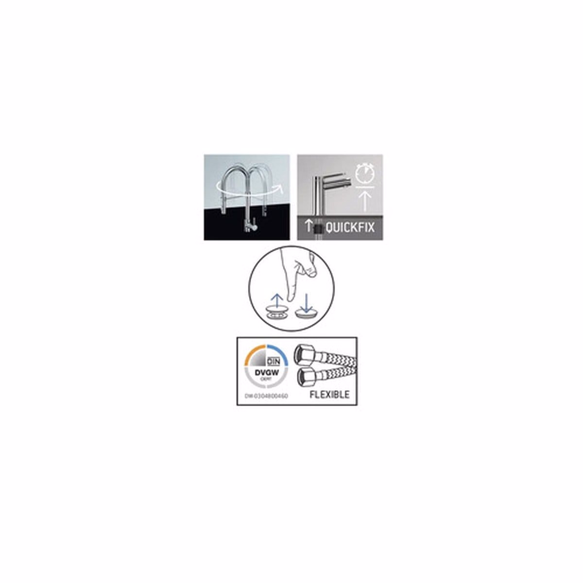 ✅ Inclus în pachetul livrat: Ventil scurgere Push-open 1 ¼”, Instrucțiuni de asamblare, Materiale pentru fixare, 2 furtunuri de racord flexibile 3/8″