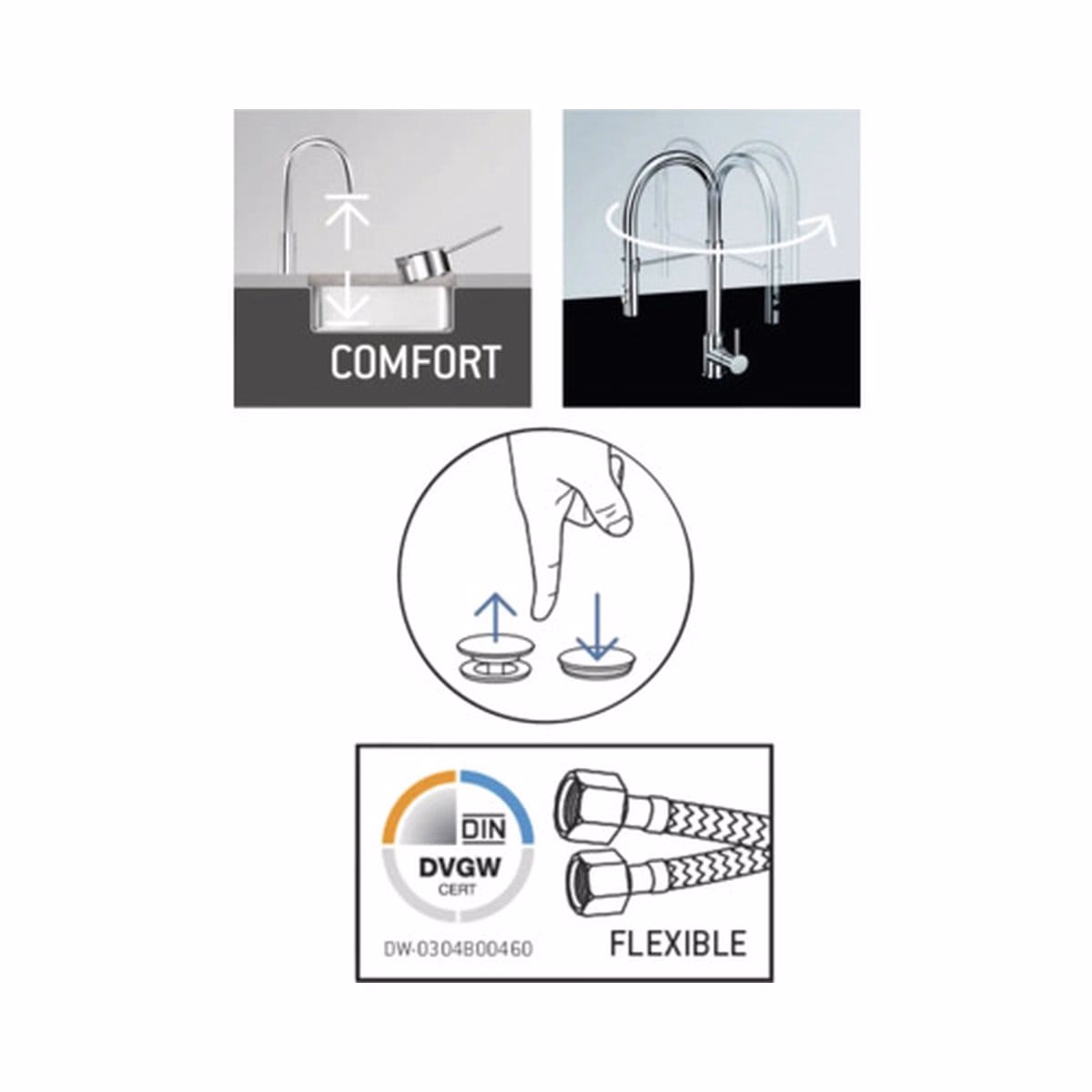 - Inclus în pachet: Instrucțiuni de asamblare, Ventil scurgere Push-open 1 ¼”, 2 furtunuri de racord flexibile 3/8″ (450 mm)