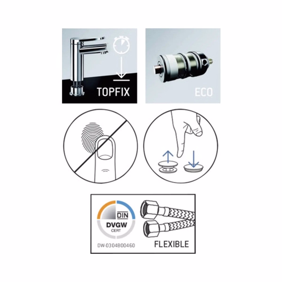 ✅ Caracteristici: Cartuș ceramic, Economie de apă (Eco), Montaj rapid de sus „Topfix”, Baterie monocomandă, AntiFingerprint, Mâner de operare din metal