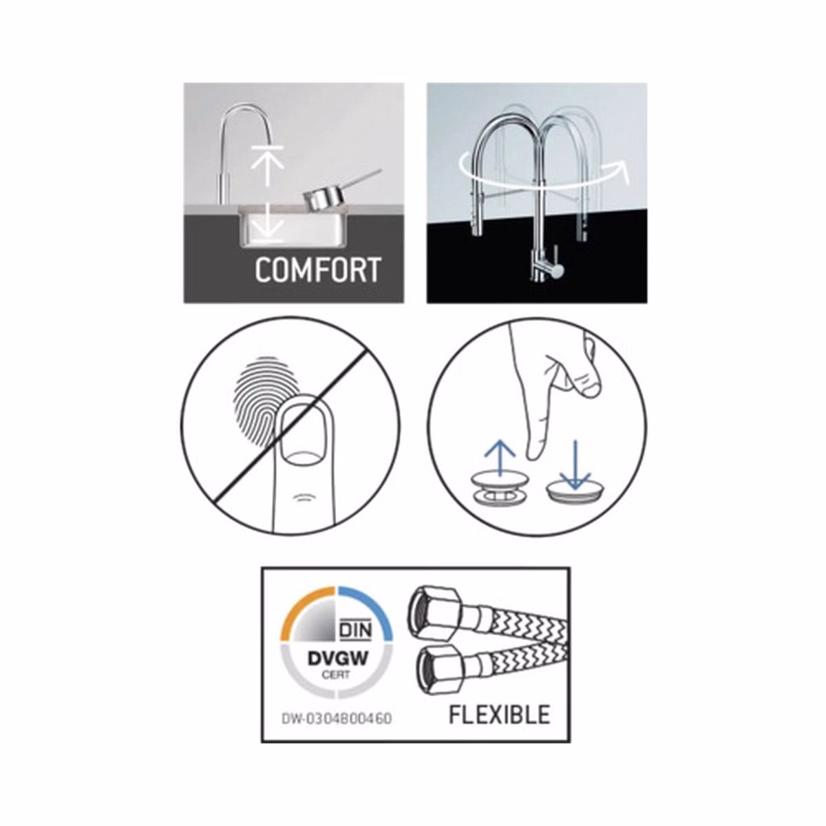 Durabilitate și calitate: Fabricată din alamă, oțel inoxidabil și zinc turnat sub presiune, bateria Avital Clyde este construită pentru a rezista în timp. Furtunurile flexibile, cu lungimea de 450 mm și filet G3/8, asigură o instalare ușoară și sigură.
