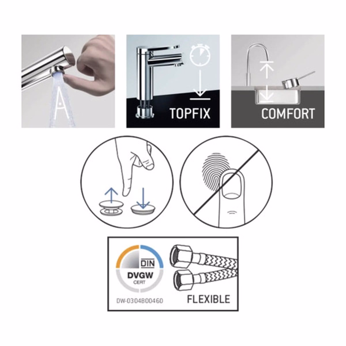 ✅ Caracteristici: Mâner de operare din metal, Pipă înaltă, Cartuș ceramic, Montaj rapid de sus „Topfix”, Baterie monocomandă, Aerator reglabil