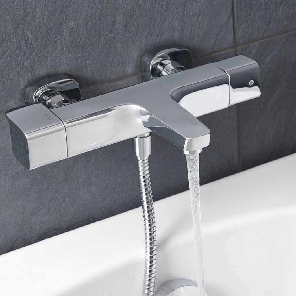 Baterie pentru cada si dus, bicomanda, GoodHome Teesta cu designul patrat, elegant al bateriei de cada termostatice, montate pe perete, de la Teesta este perfect pentru o baie contemporana.