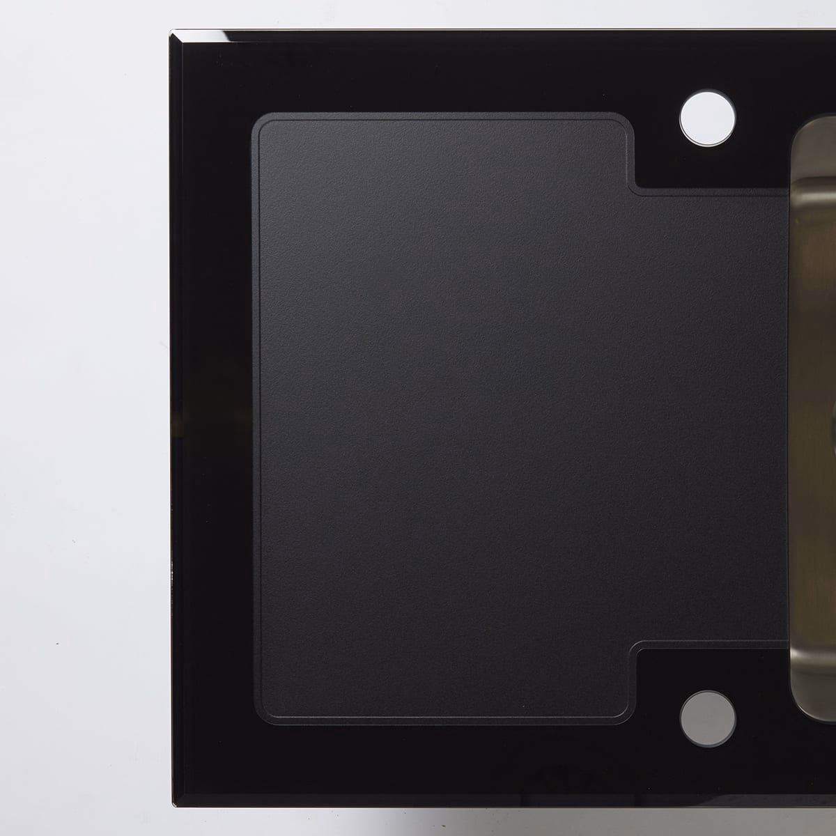 Chiuveta bucatarie sticla neagra, 95 x 50 cm, adancime 21 cm, 1.5 cuve, vine cu blat din sticla, chiuveta, cleme pentru chiuveta, capac pentru orificiu de prindere, banda de scurgere, manual de instructiuni