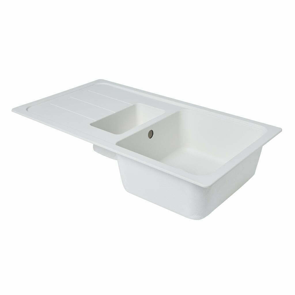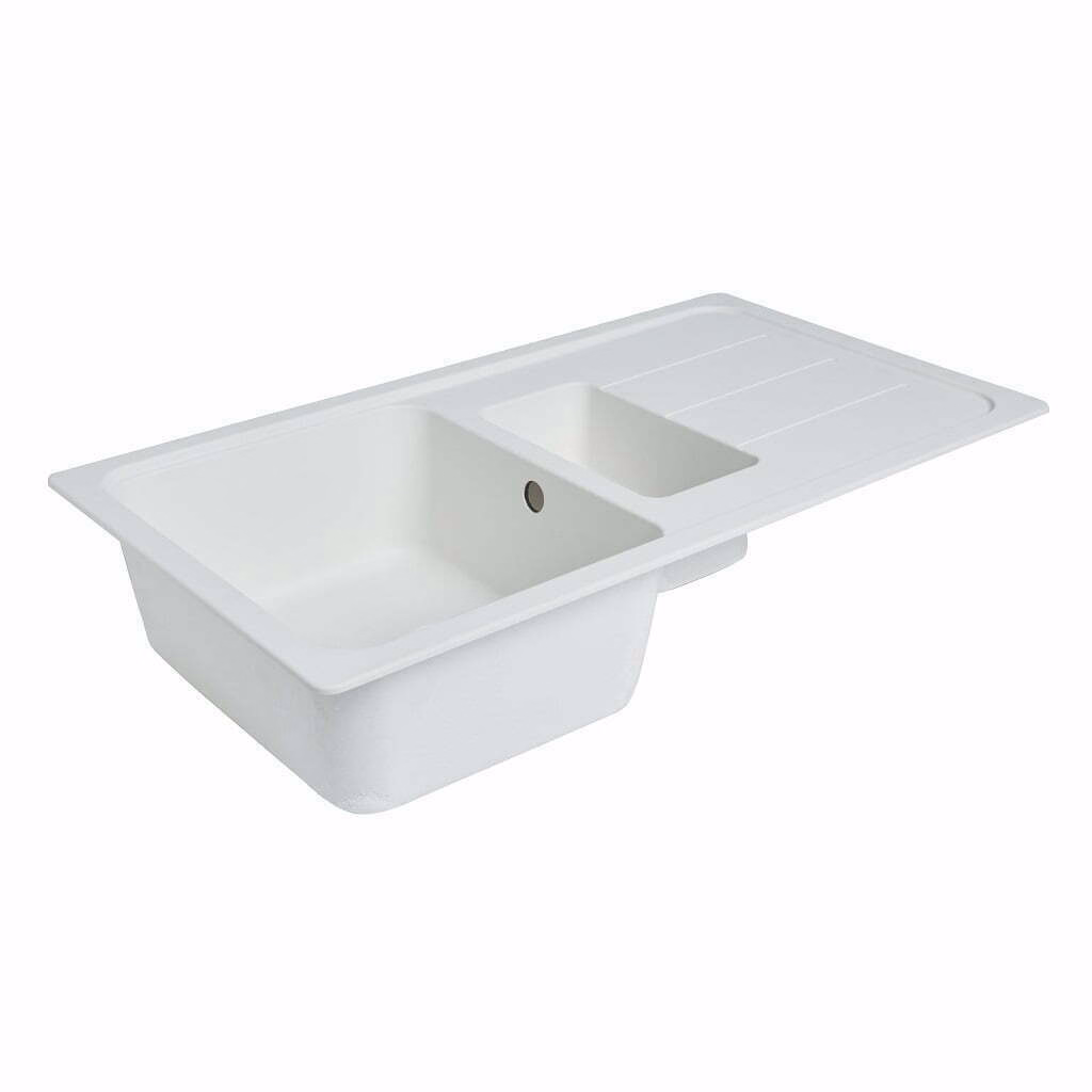 Chiuveta din cuart compozit destinata utilizarii in bucatarie. Are forma dreptunghiulara si culoare alba, cu finisaj metalic. Se monteaza pe blat si are dimensiunile de 90 cm (lungime) x 50 cm (latime) x 20,2 cm (adancime).
