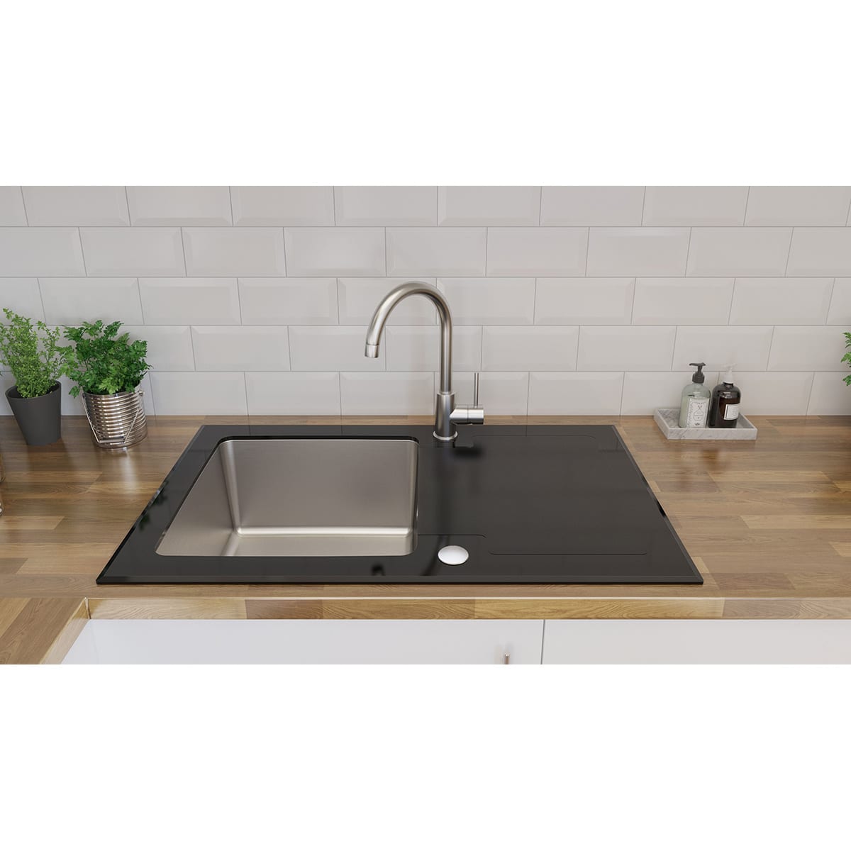 Alege Chiuveta din inox Cooke&Lewis Christianna cu finisaj lucios si sticla neagra pentru un aspect modern si elegant.