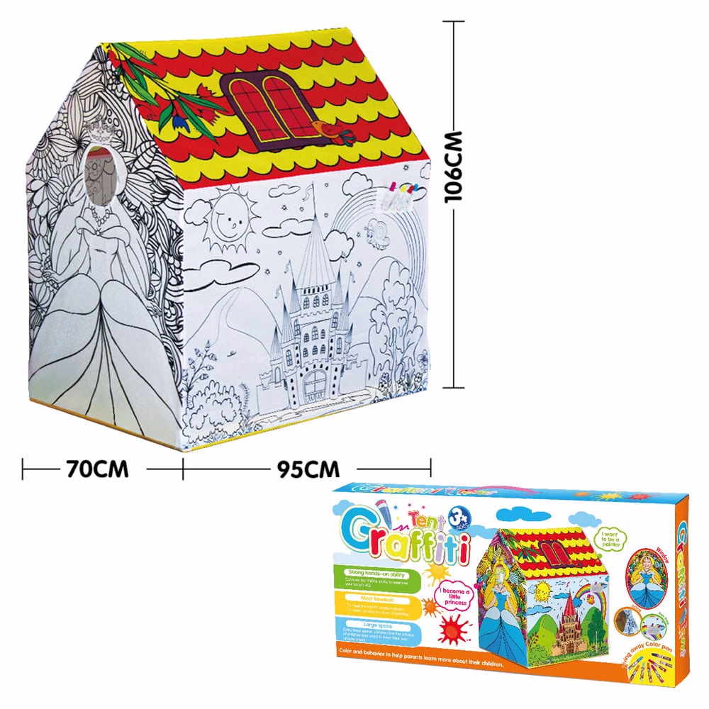 Cortul de joaca este lavabil din material textil si poate fi colorat si apoi spalat si din nou colorat.