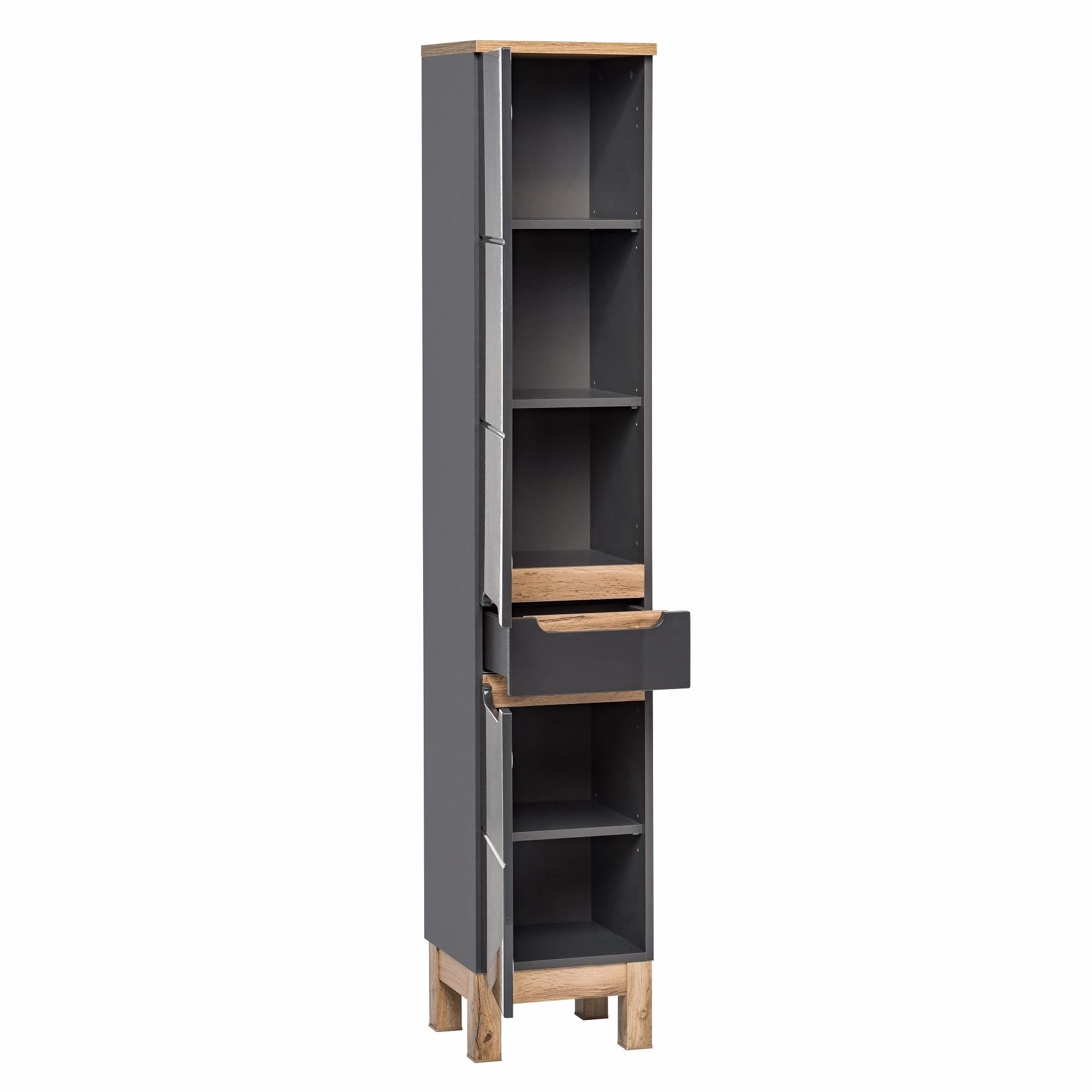 Transforma-ti baia intr-un sanctuar al stilului si functionalitatii cu Dulap baie coloana gri inchis, cu usi si sertare, avand dimensiunile de 87 x 33 cm.