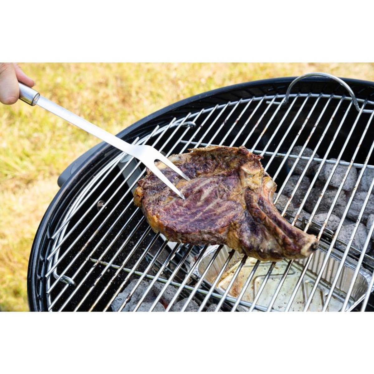 Cu o lungime totală de 35 cm, furculița vă permite să manipulați și să serviți preparatele în siguranță, menținând o distanță optimă față de căldura jarului. Designul include un mâner ergonomic, conceput pentru a oferi confort și control maxim în timpul utilizării.
