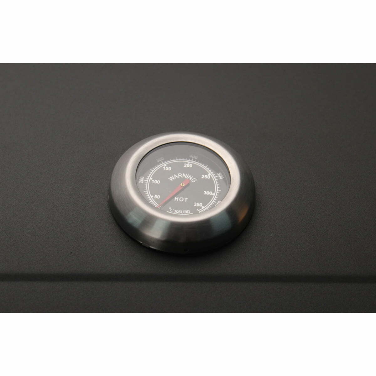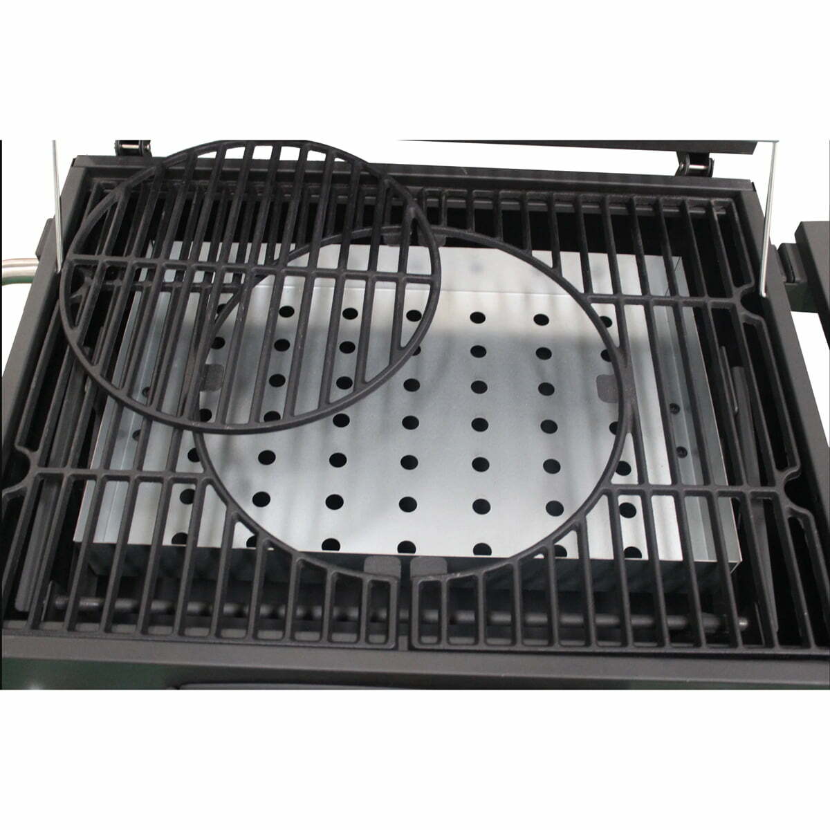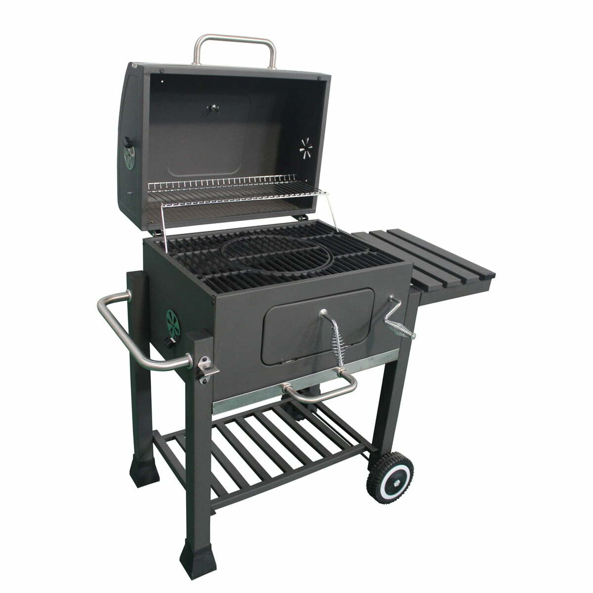 Are termometru incorporat in capac, dotat cu desfacator de bere incorporat, inaltime tava cu carbuni reglabila, suport lateral pentru depozitare, sistem de ventilatie pentru reglarea temperaturii si a timpului de gatit.