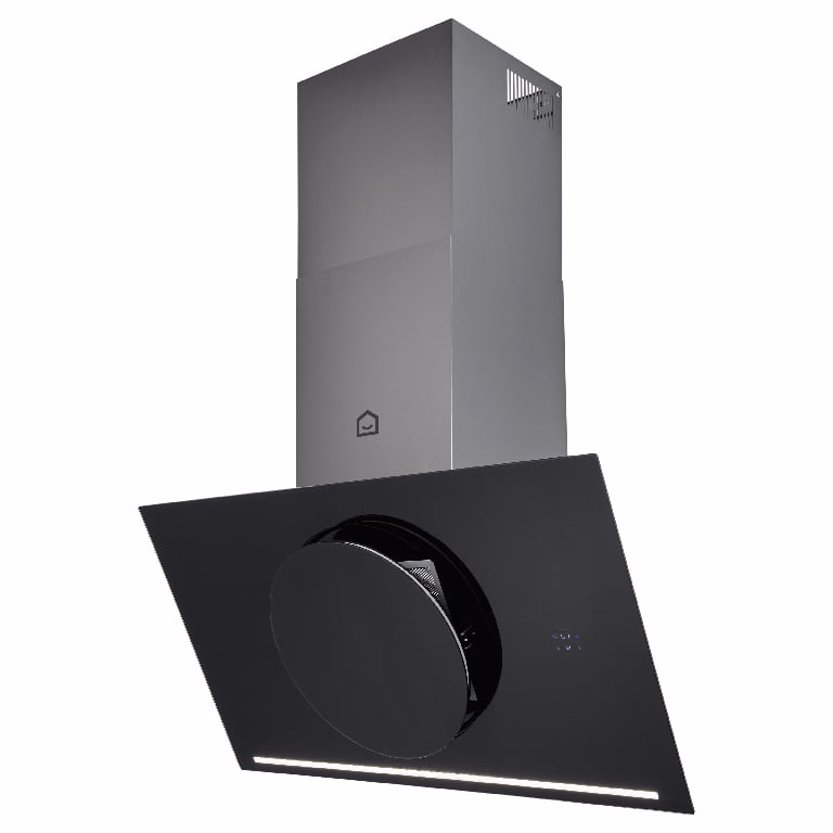 Hota decorativa inclinata GoodHome are un panou central motorizat, pentru a permite ca evacuarea sa fie activata de un senzor de miscare.