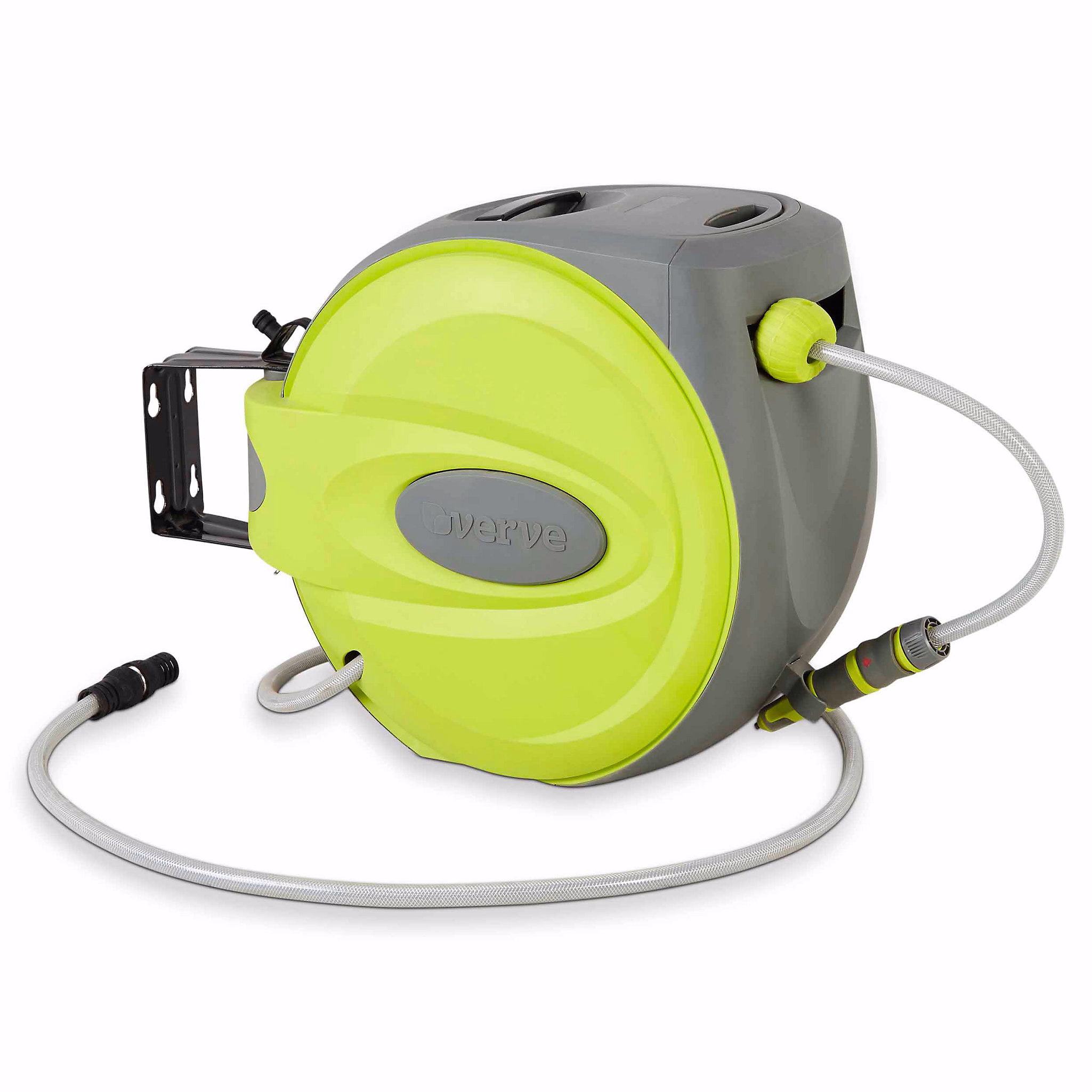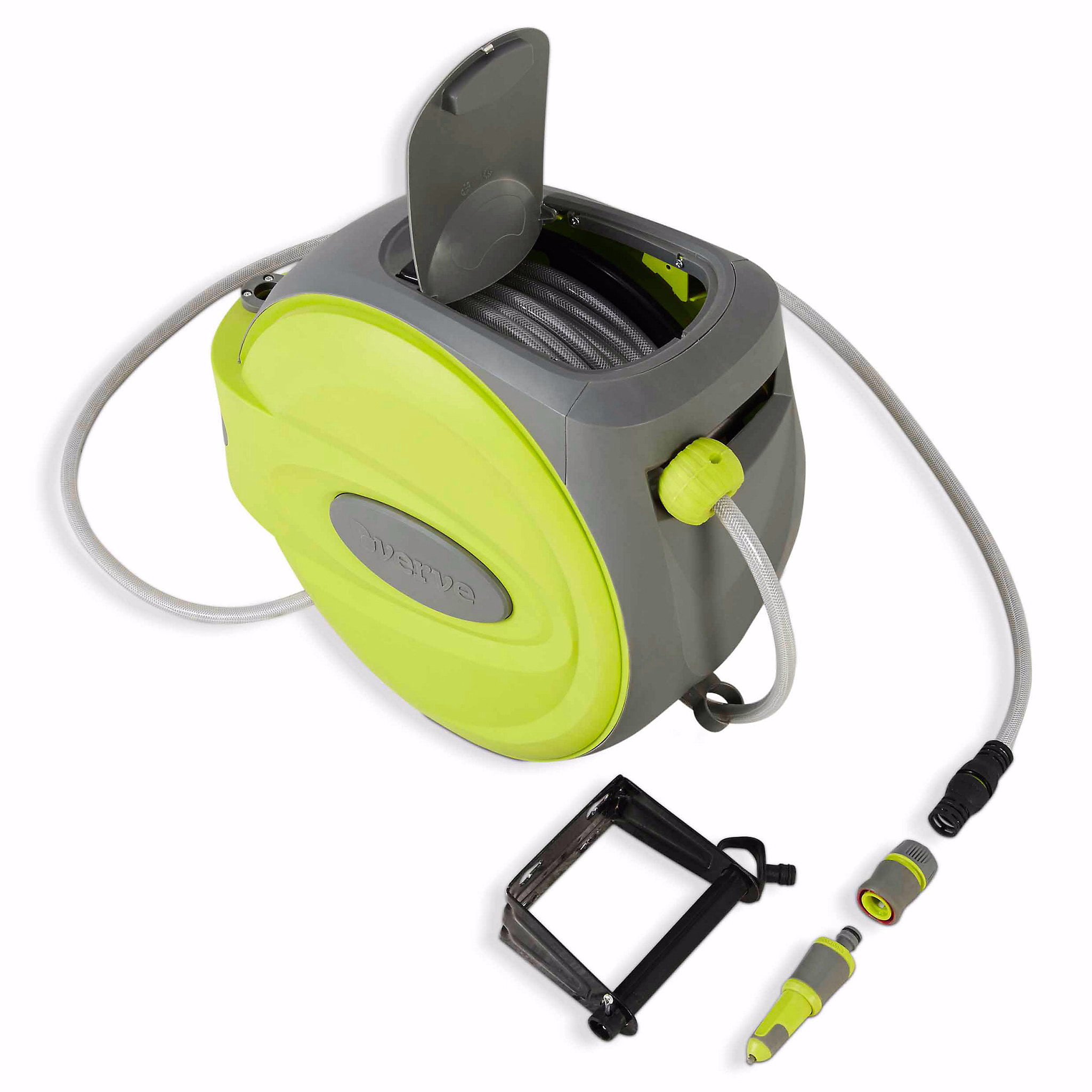 O rola de furtun inchisa pentru toate scopurile, care poate fi montata pe perete, permitand utilizatorului sa-si ude usor gradina