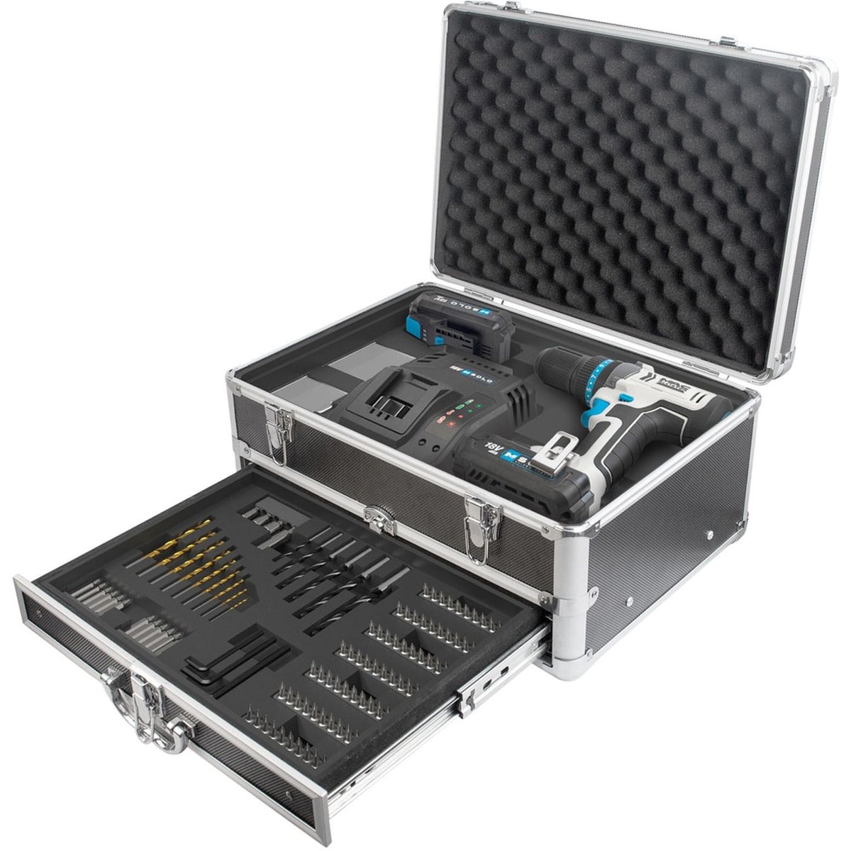 - ✅ Conținut pachet: Masina de gaurit si insurubat, 2 acumulatori Li-ion de 2 Ah, 1 încărcător de 2.4 A, 158 de accesorii