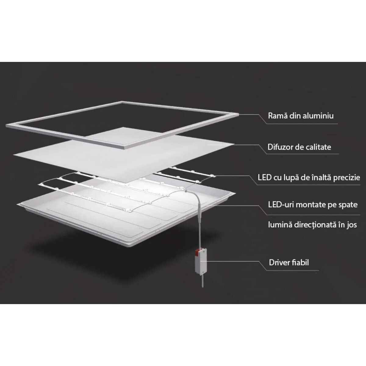 Ceea ce diferentiaza acest panou LED de altele este faptul ca difuzorul nu se va ingalbeni si nu se va pata, datorita constructiei lui.