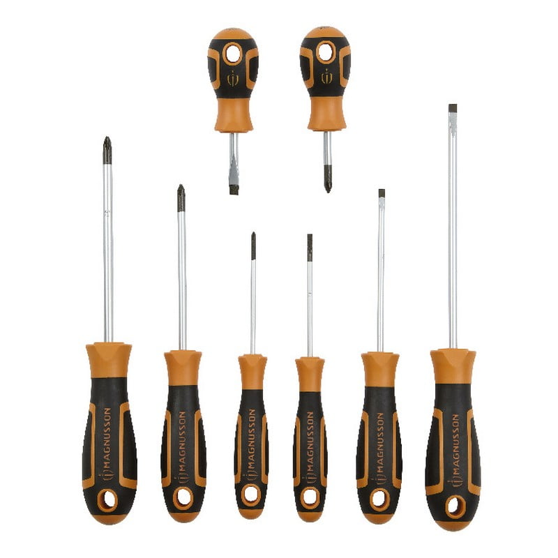 Setul de 8 surubelnite de la Magnusson contine 30 de varfuri de otel pentru toate tipurile de suruburi existente.