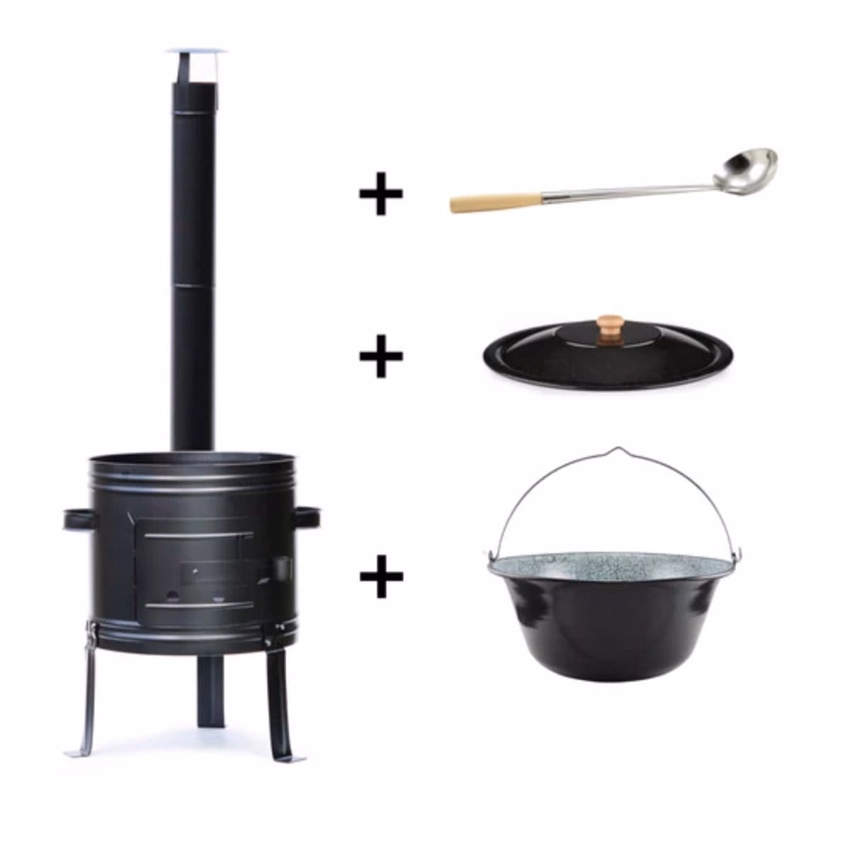 Setul include o sobă robustă din oțel, cu un diametru de 36 cm și horn integrat, asigurând o ardere eficientă și o distribuție uniformă a căldurii. Alături de sobă, vei găsi un ceaun emailat de 14 litri, ideal pentru porții generoase de supe, tocănițe sau gulaș, precum și un polonic practic din inox, cu o capacitate de 250 ml.