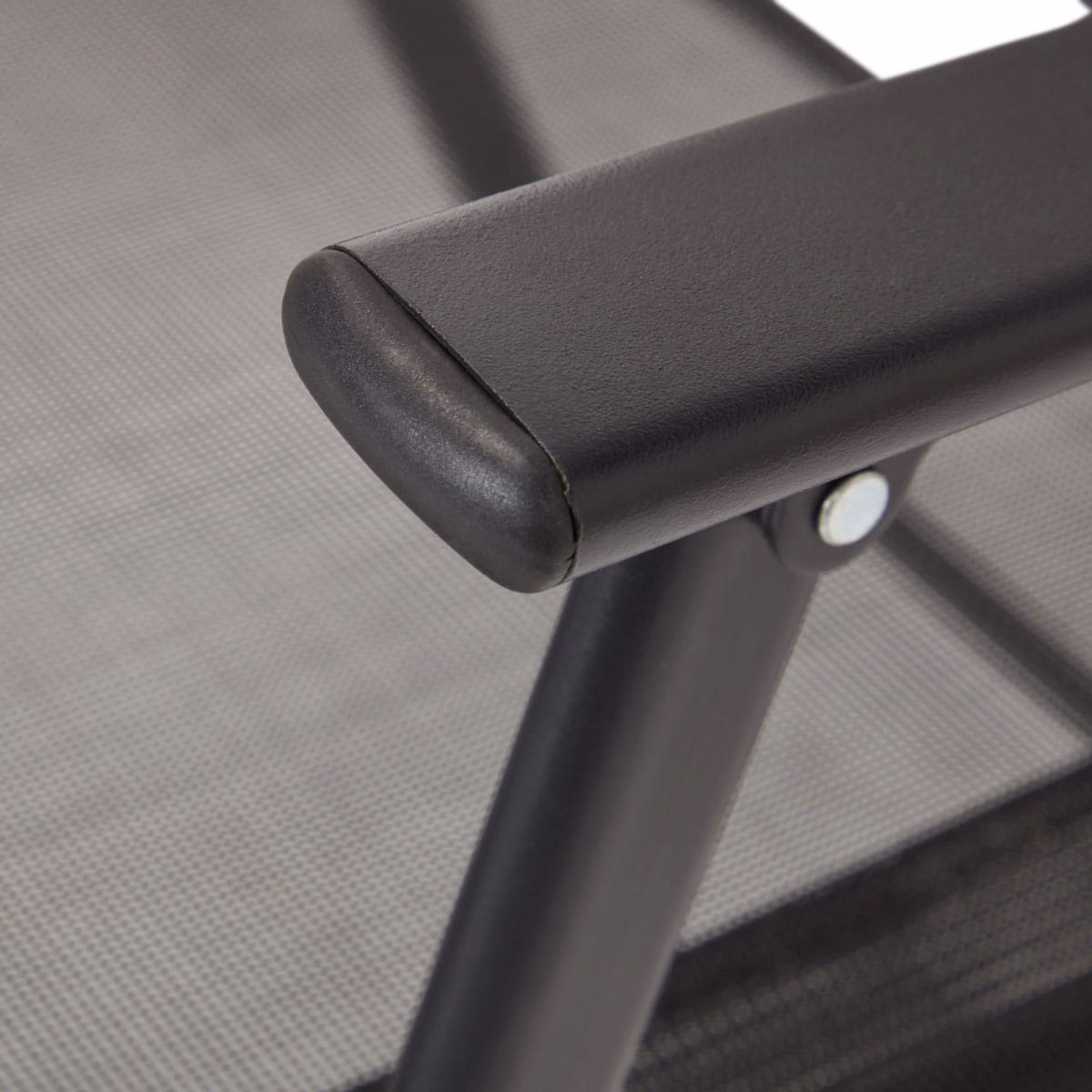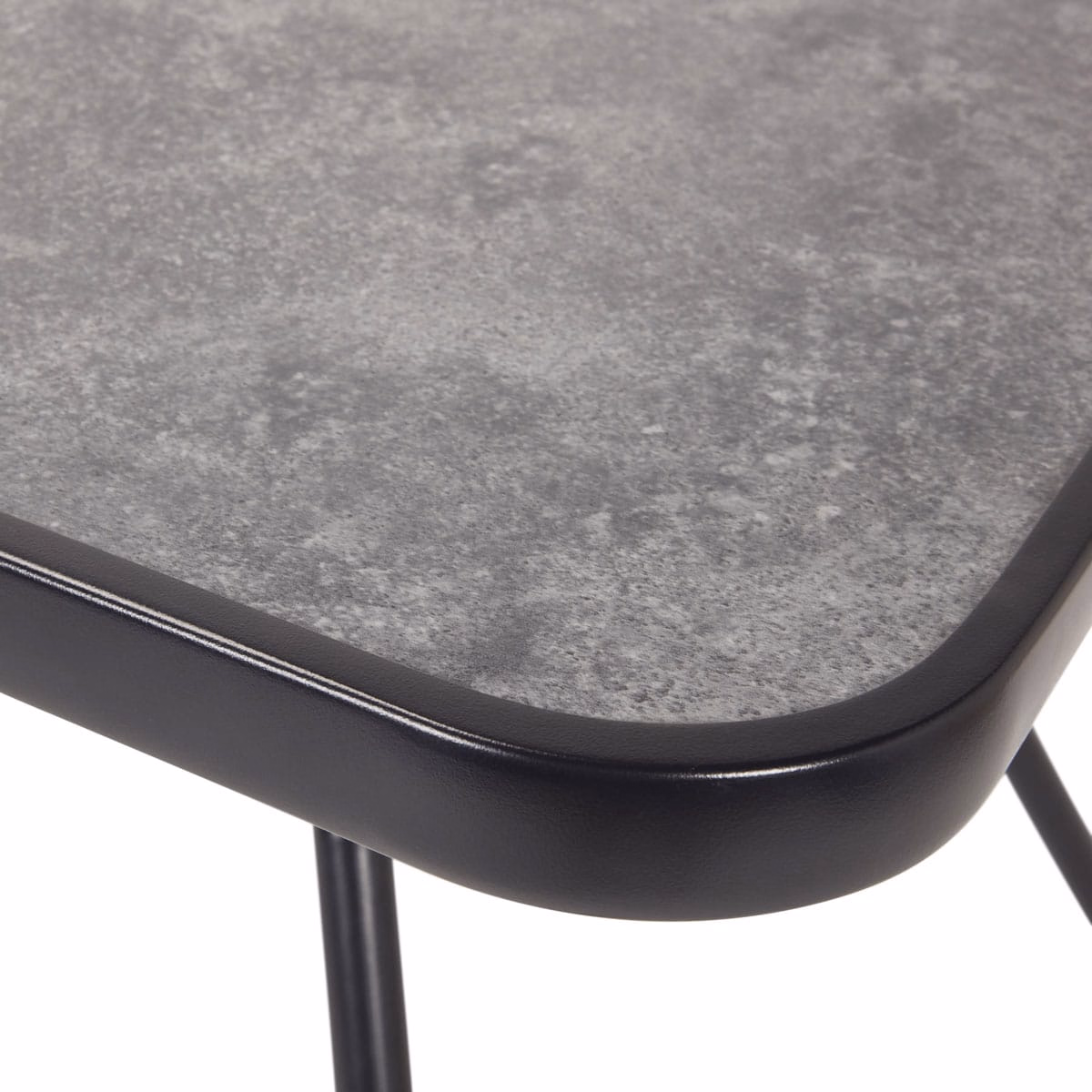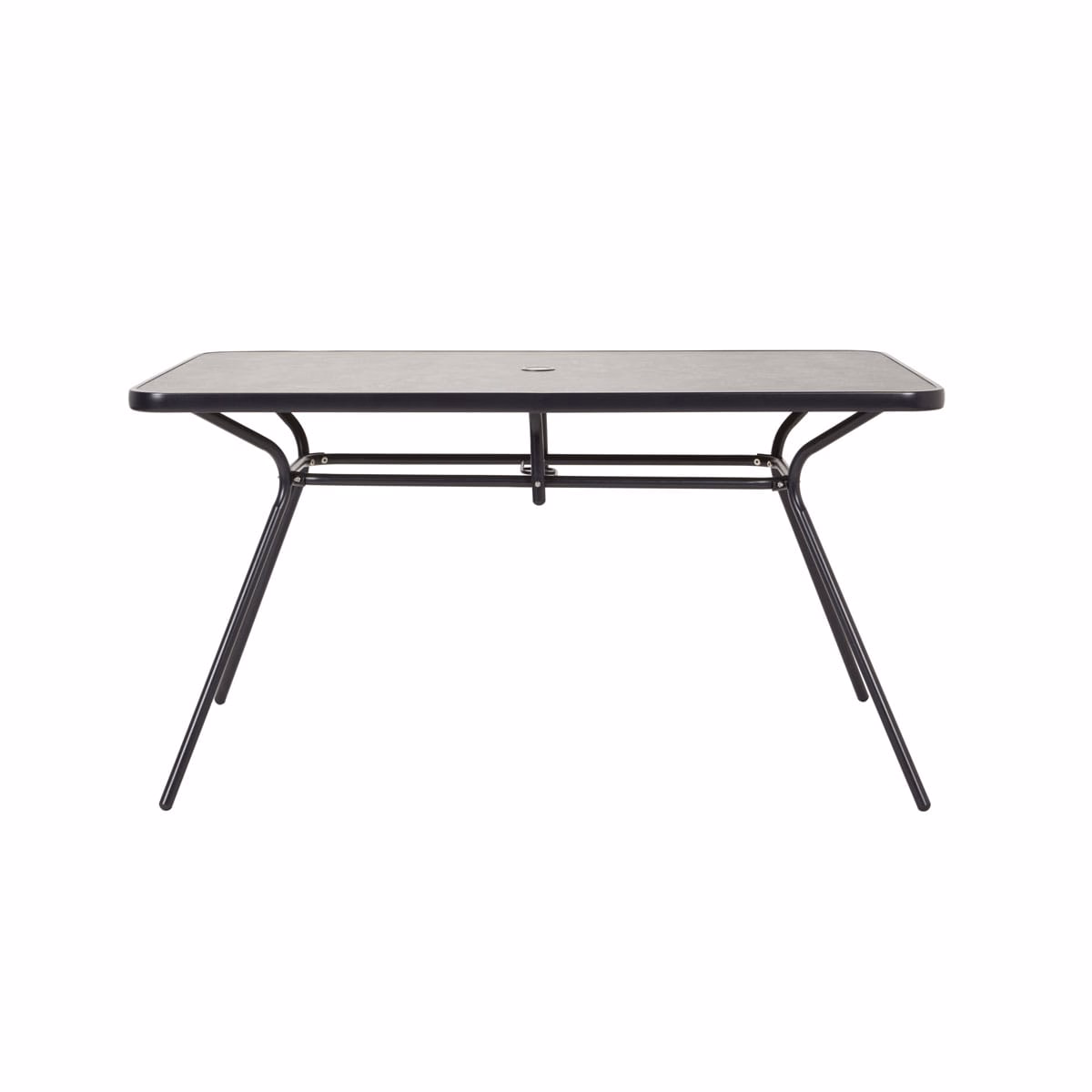 Masa are structura metalica si se livreaza insotita de un blat de sticla. Scaunele sunt fabricate din metal acoperit cu tesatura sintetica de culoare neagra iar umbrela are suportul din metal si cupola din tesatura sintetica neagra. Pentru un plus de confort scaunele sunt prevazute cu cotiere din plastic.