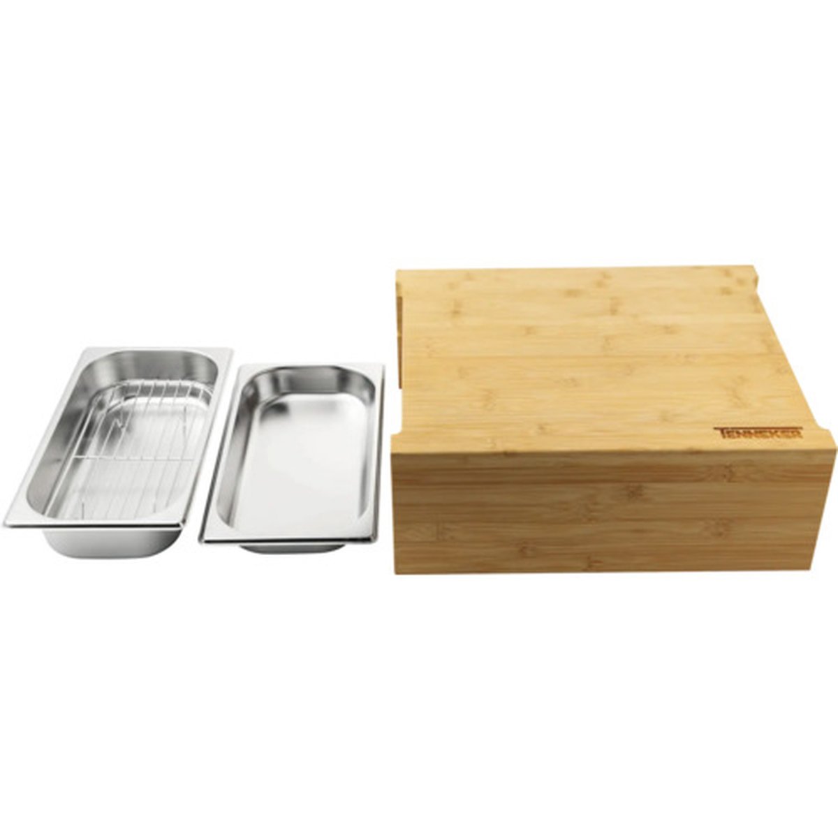 Acest tocător versatil combină funcționalitatea cu estetica, oferind o suprafață de lucru spațioasă și tăvi practice pentru a organiza ingredientele sau preparatele gătite. Materialul din oțel inoxidabil garantează rezistență la coroziune și ușurință în întreținere, fiind totodată igienic și sigur pentru contactul cu alimentele.